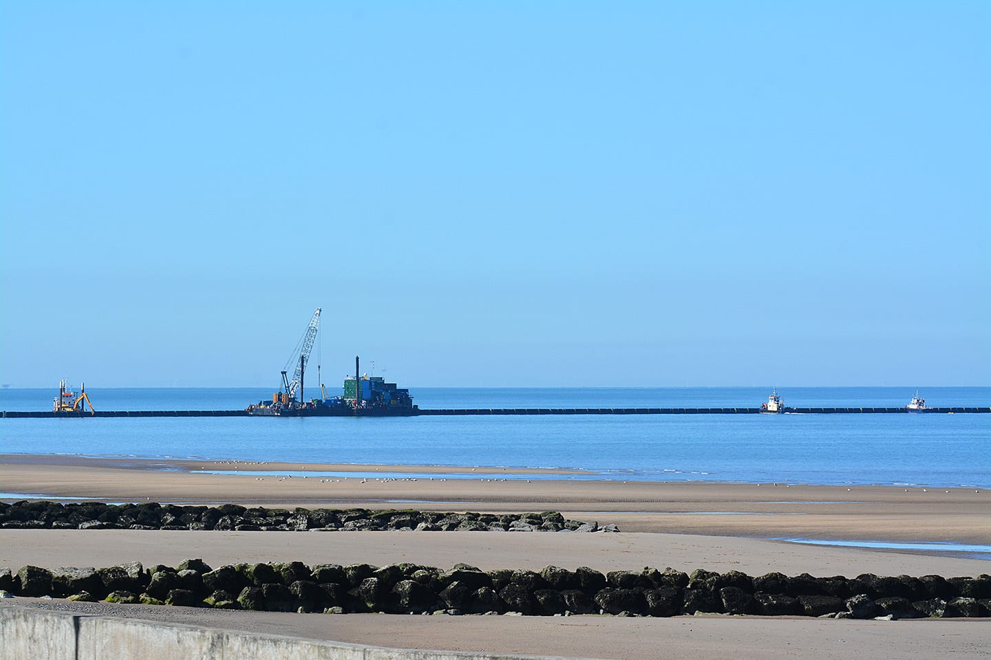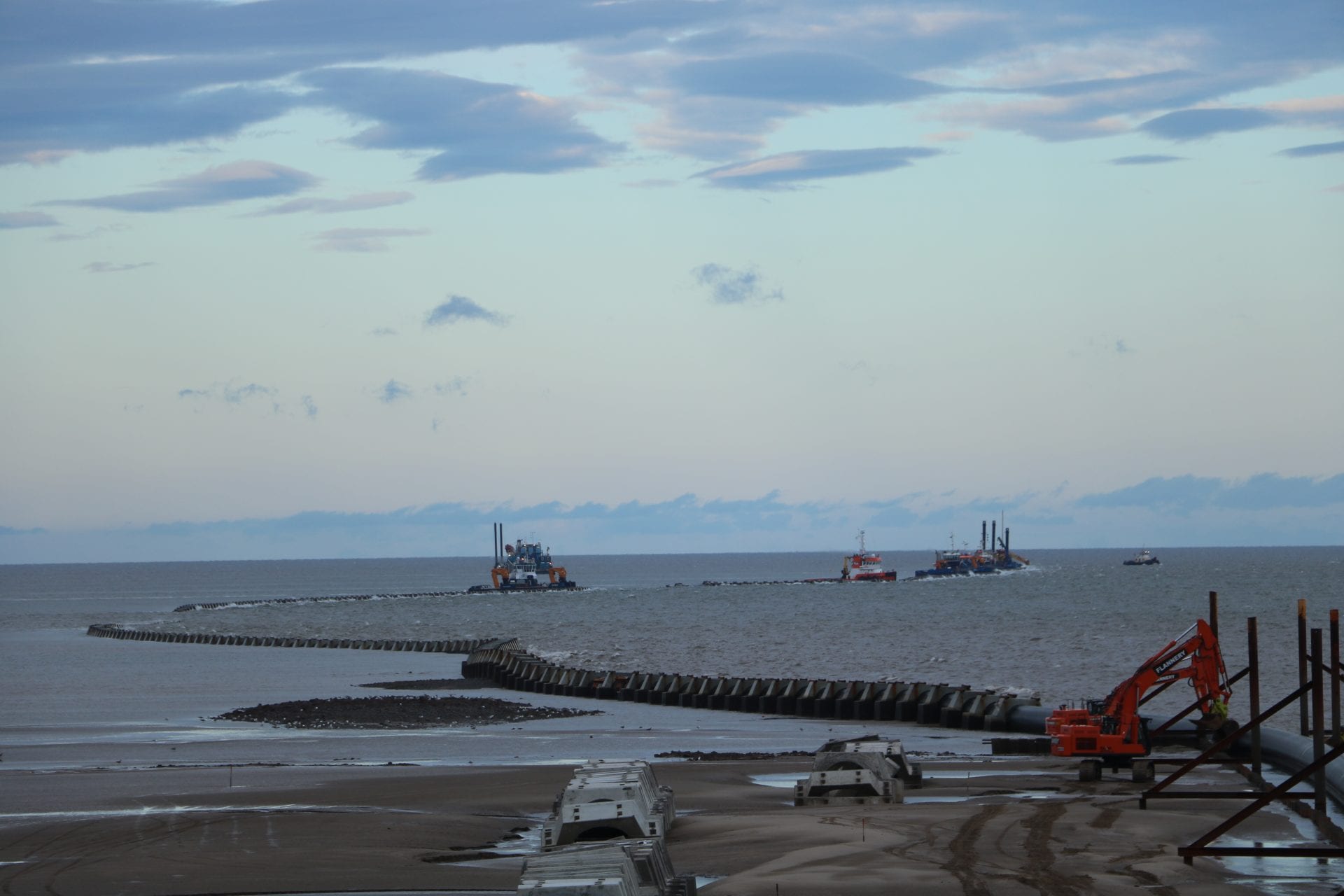 A trenching vessel carried out dredging works as part of this process, you can see it in action in these clips below. A cofferdam structure was built on the beach, so that the engineering works can take place.