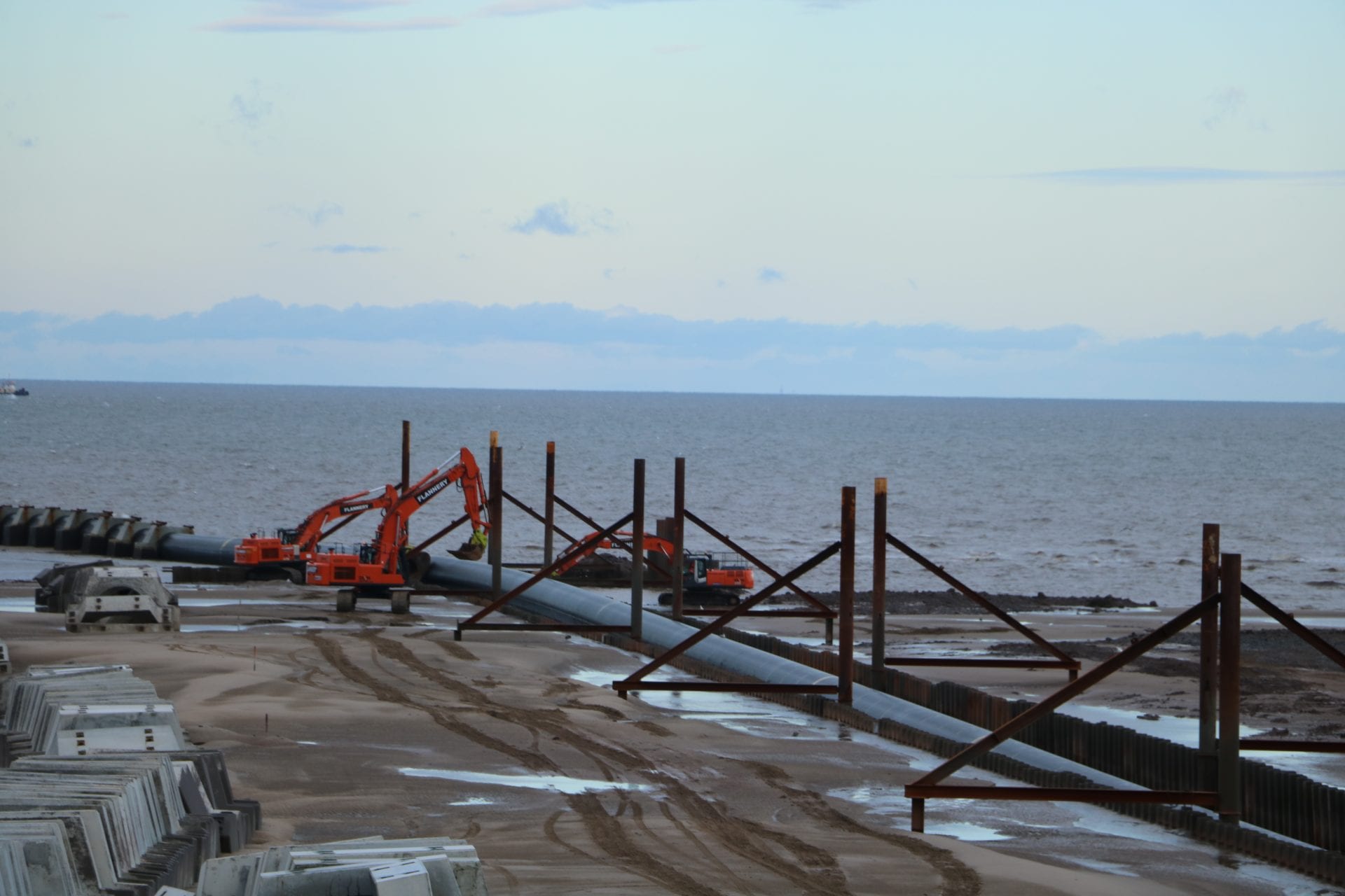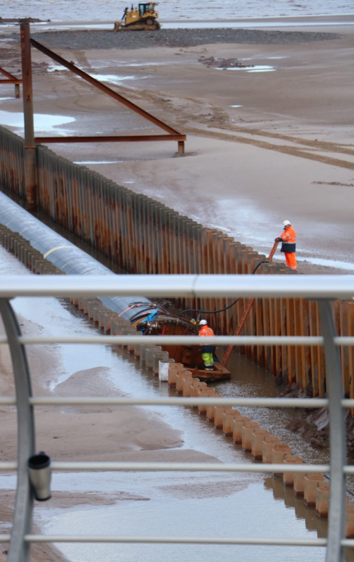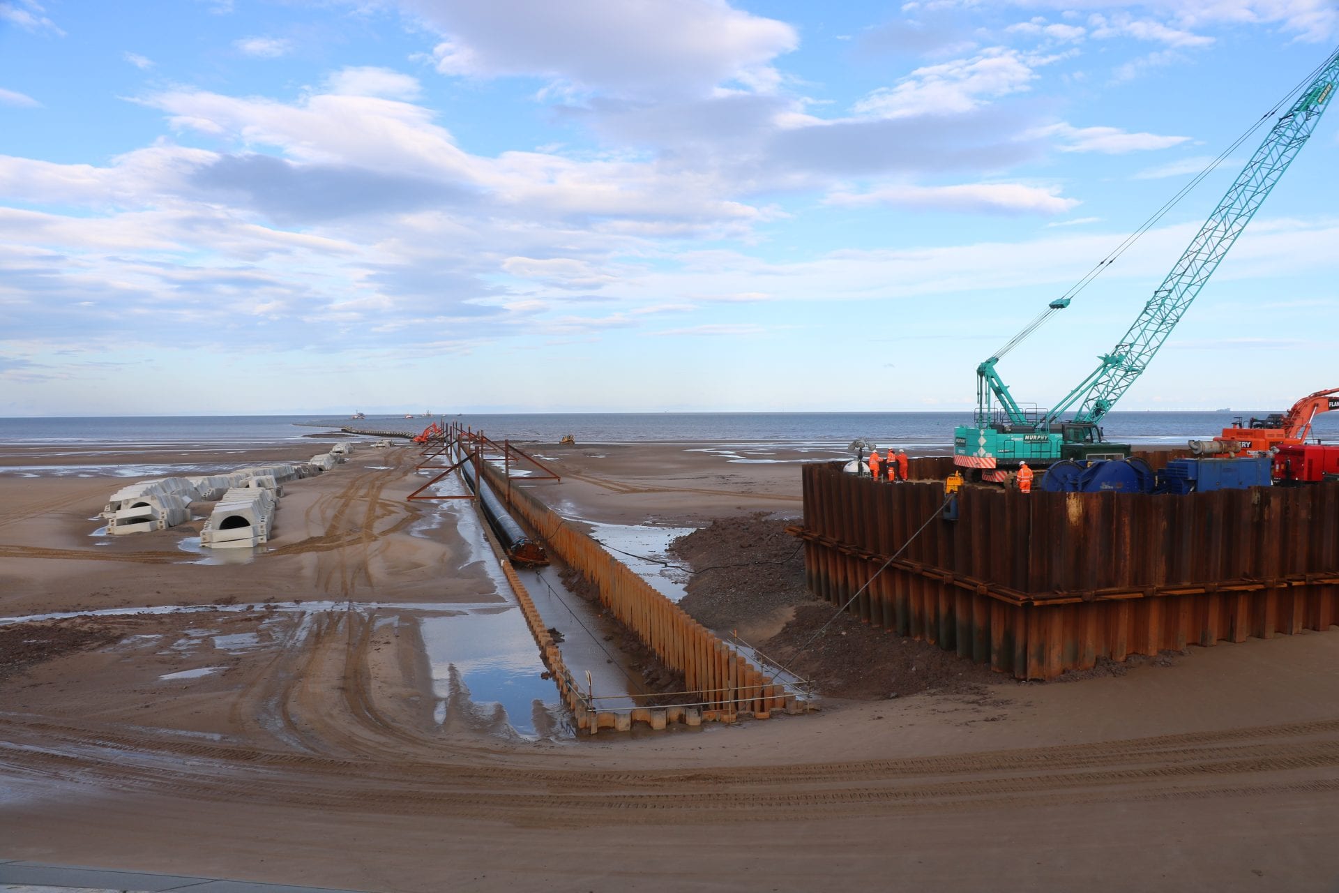 Two lines of sheet piles were installed on the beach and the area within them was excavated in preparation for the pipe.