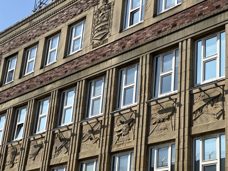 Now called Progress House and originally the site of St John’s New Market, this extension dates to 1977. Look upwards above the first floor windows and you’ll see an ornate stone frieze around the building. Each of the tablets depicts methods of transport through the ages.