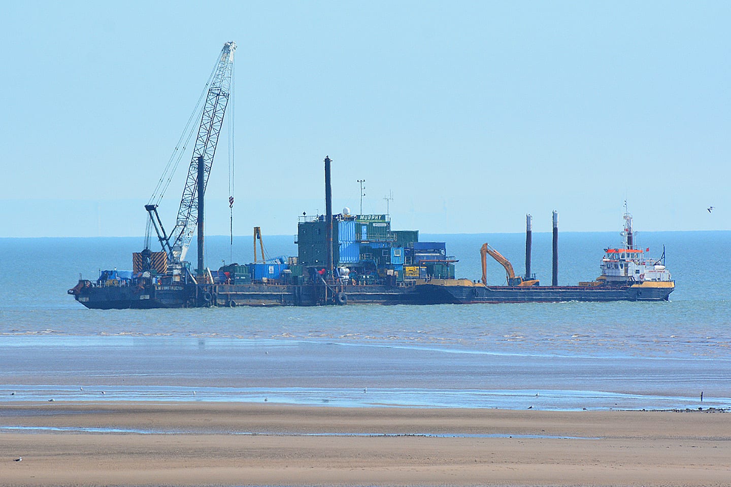 A trenching vessel carried out dredging works as part of this process, you can see it in action in these clips below. A cofferdam structure was built on the beach, so that the engineering works can take place.